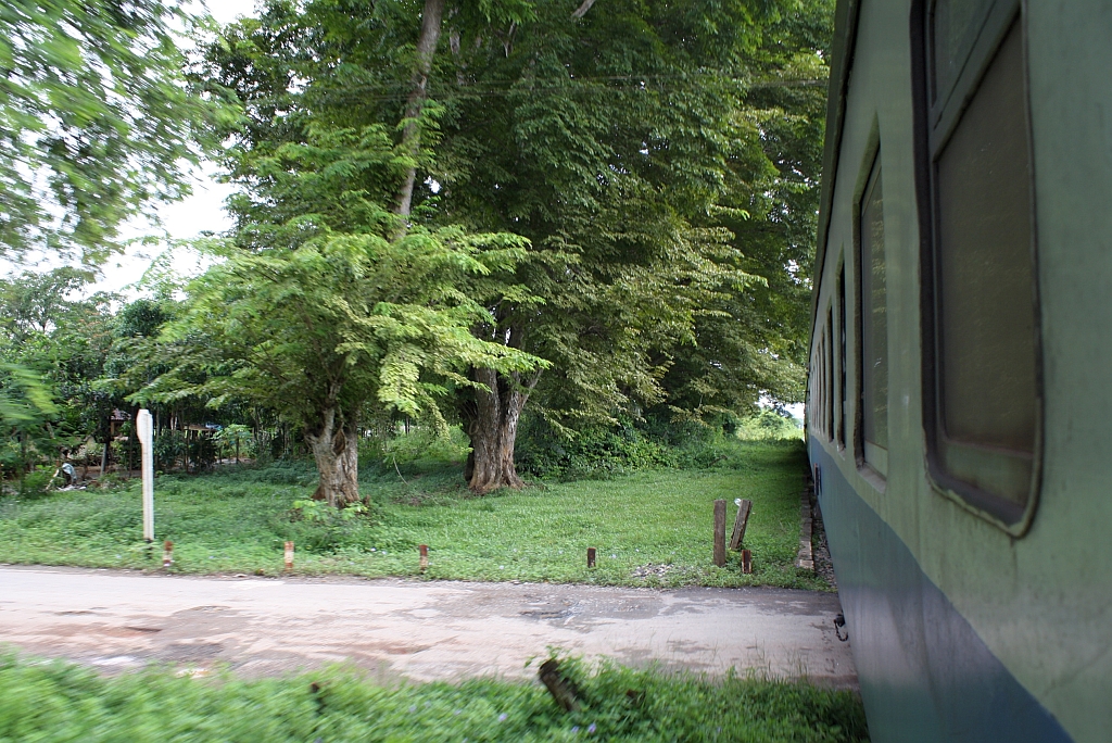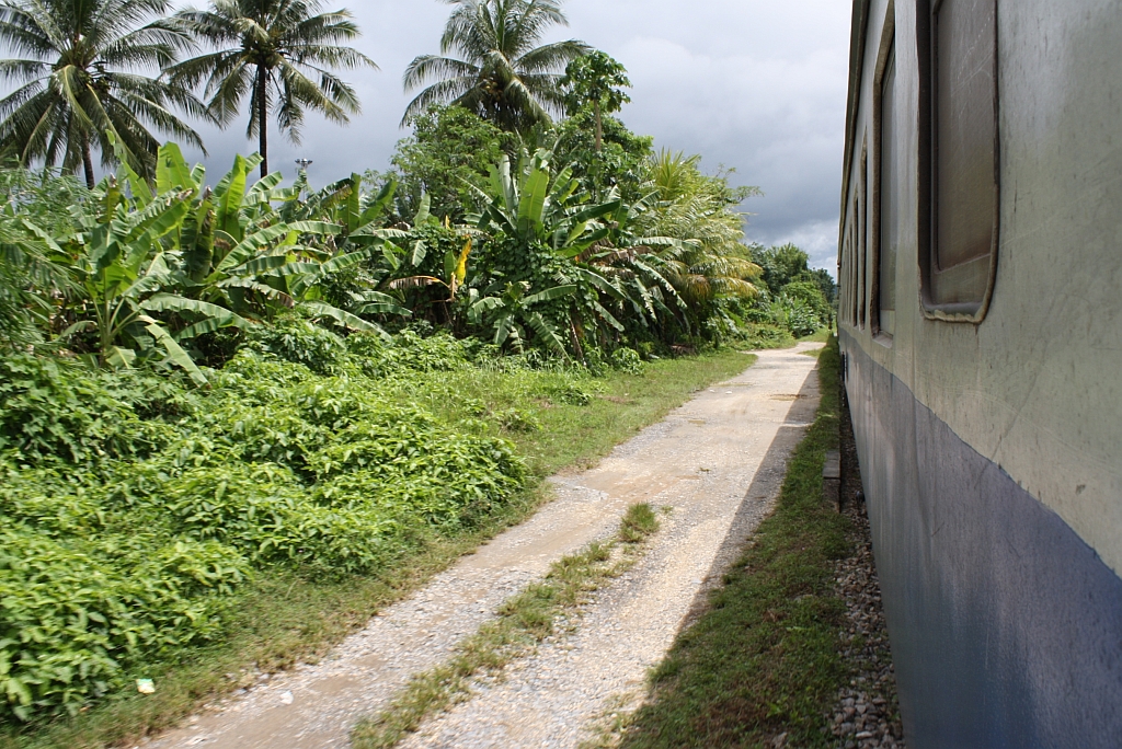 Wenn nicht die Bahnsteigkante erhalten geblieben wäre, würde niemand mehr hier die aufgelassenen Hst. Lam Phu Ra vermuten. Blickrichtung Thung Song Jn. am 25.August 2011.