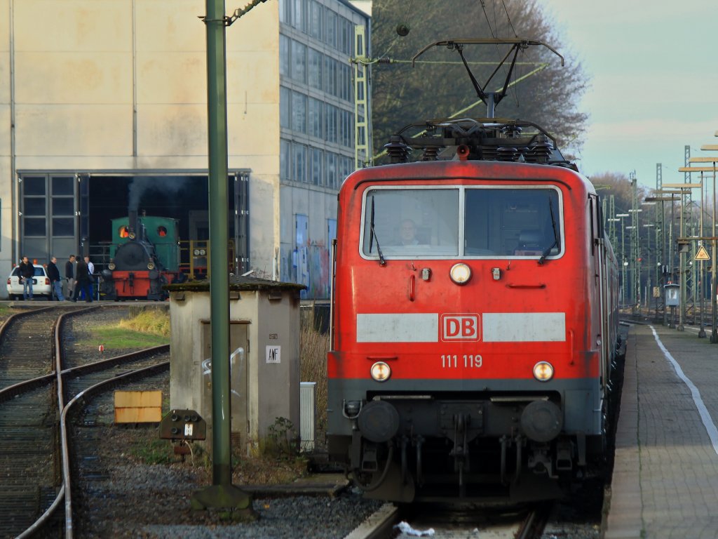 111 119 zieht am 11.01.2012 den RE4 in den Bahnhof Aachen West. Links im Bild die Dampflok der RWTH Aachen am Institut für Schienenfahrzeuge.