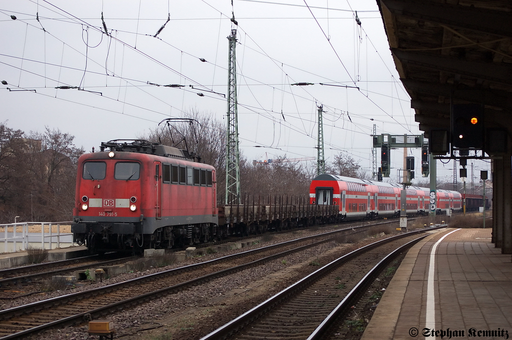 140 791-5 überführt eine Doppelstockgarnitur der Israel Railways (IR) und durch fährt den Haltepunkt Magdeburg-Neustadt. Es handelt sich um fünf Mittelwagen mit den Nummern 2107, 2234, 2235, 2236 und 2237 und einem Steuerwagen mit der Nummer 2007. Laut dem Raster sind diese Wagen für 140 ausgelegt, aber ob das auch für Israel gilt oder nur für Europa das weiß ich nicht. 11.01.2012