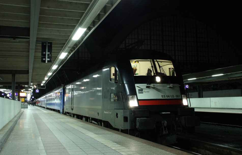 182 061 mit CNL 472 von Basel nach Kopenhagen mit Kurswagen nach Moskau.Aufgenommen am 08.01.12 in Karlsruhe Hbf.