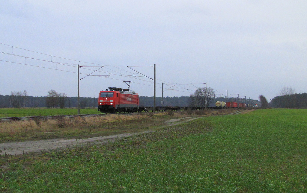 Am 07.01.2012 war es mal wieder soweit! Mit dem Kollegen Wiemer ging es mal wieder auf Tour! Und obwohl das Wetter alles andere als gut war war die Ausbeute doch recht gut. Den Anfang machte 189 058. Sie zog einen Containerzug von Guben nach Hamburg. Hier sieht man den Zug in Löpten (in der Nähe vom Tropical Island).
