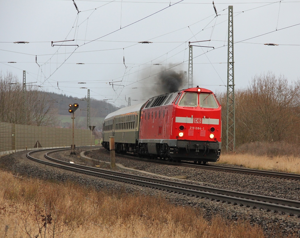Das letzte mal "Advents-Express". Am vierten Advents-Wochenende verkehrte dieser Zug mit 219 084-1 letztmalig zwischen Göttingen und Erfurt für das Jahr 2011. Ob Absicht oder nicht, war zu diesem Anlass der Wagenpark komplett auf eine alte DR-Wagen-Garnitur umgestellt worden. Hier am Morgen auf dem Weg in Richtung Erfurt bei Friedland(HAN). Aufgenommen am 17.12.2011.