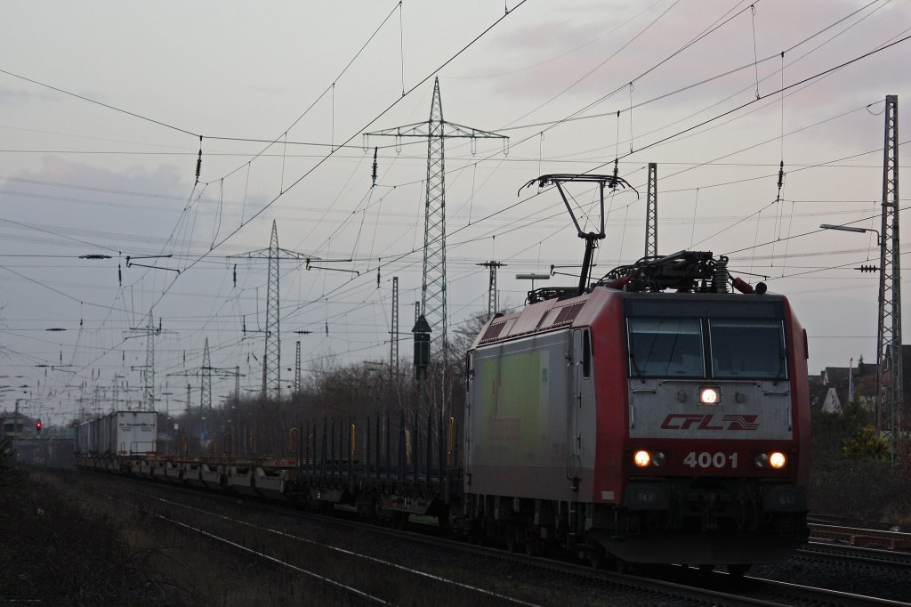 Die CFL 4001 fuhr am 6.1.12 mit dem ca.10 Stunden verspäteten DGS 42680 Lübeck Skandinavienkai-Bettembourg durch Ratingen-Lintorf.