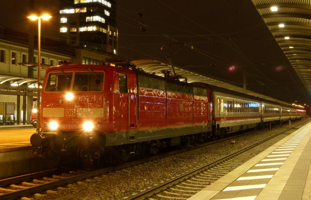Die Hauptuntersuchte und neu gestrichene 181 205-6 steht mit dem IC 2054 Frankfurt (Main) – Saarbrücken am 12.01.2012 in Kaiserslautern