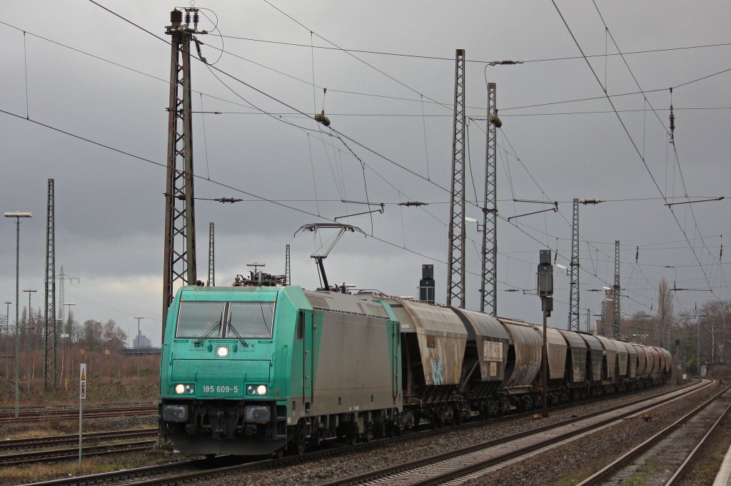 Die von LTE angemietete 185 609 fuhr am 7.1.12 mit einem Getreidezug durch Duisburg-Bissingheim.
