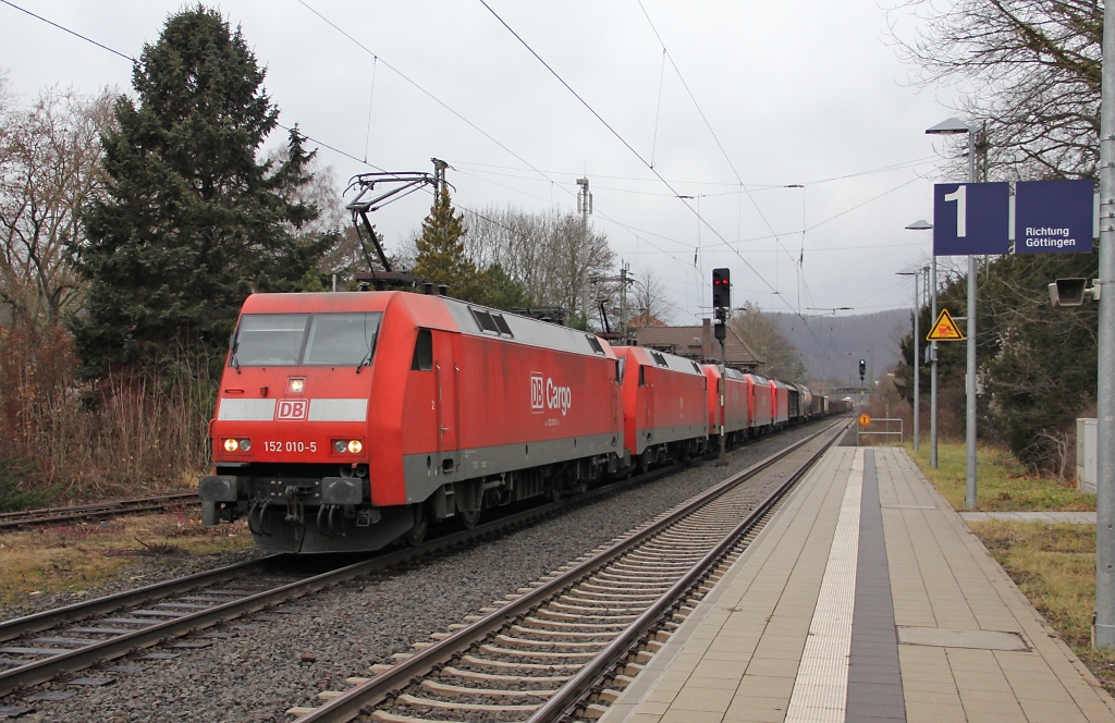 Dieser Gz in Richtung Süden hatte ziemlich viele rote Loks vorn dran :-) Neben den Zugloks 152 010-5 und 152 140 wurden als Wagenloks noch 145 054, 145 036 und 185 365 mit überführt. Aufgenommen am 21.12.2011 in Bad Sooden-Allendorf.
