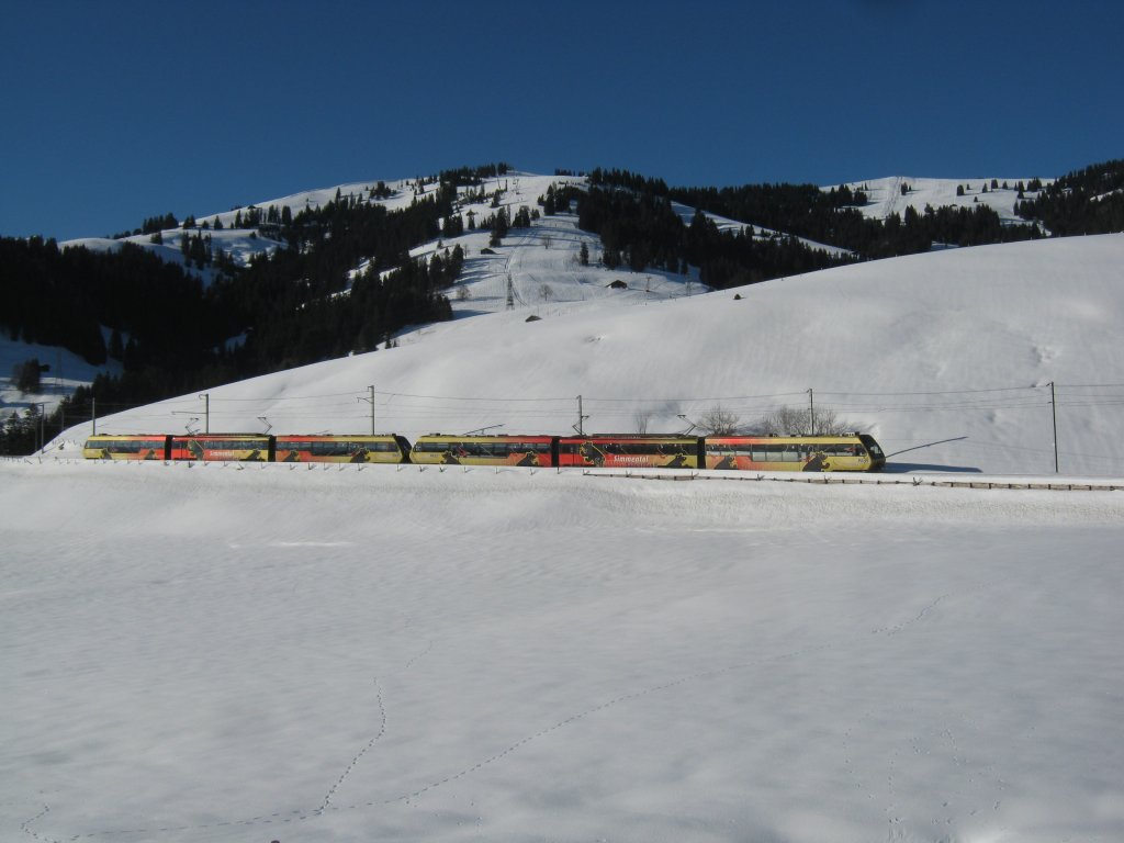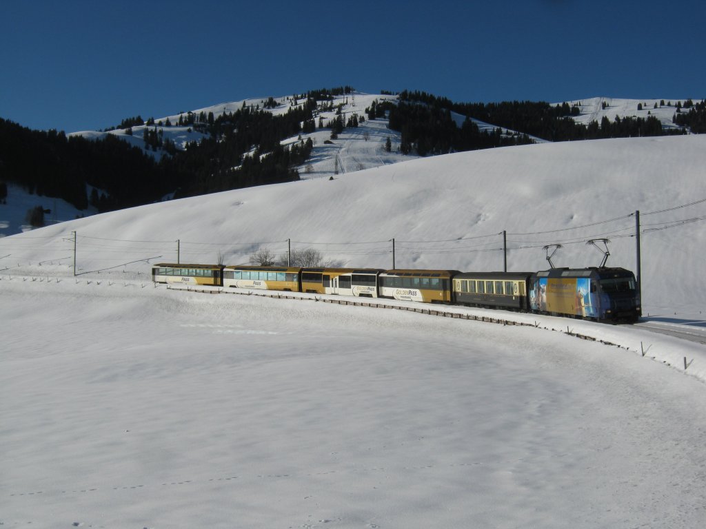Ge 4/4 800x mit dem D 3123 zwischen Schönried und Gstaad, 12.01.2012.