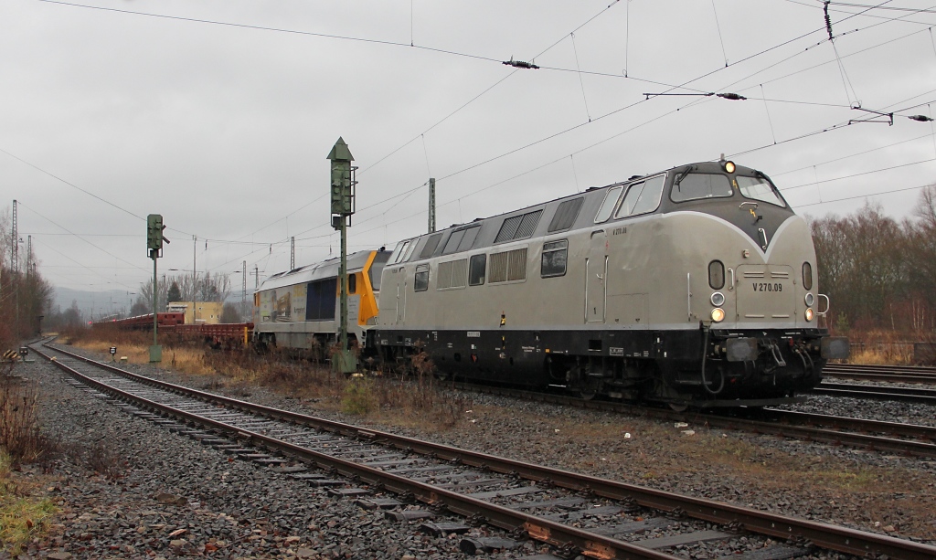 Ein vorzeitiges Weihnachtsgeschenk gab es am 22.12.2011 in Form von V270.09 mit 264 009, die mit ihrem Flach- und Schotterwagen einen kurzen Signalhalt in Eschwege West einlegen mussten, bevor sie ihre Fahrt gen Süden fortsetzten konnten. Ein echtes Highlight.
