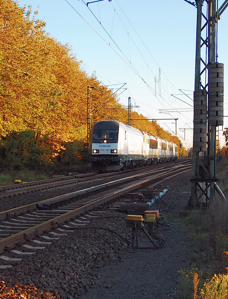 ER 20 2007 mit reichlich Belgiern am Hacken beim Bahnübergang Hackenbroicher Straße am 15. Oktober 2011 kommen sie hier vorbei gefahren.