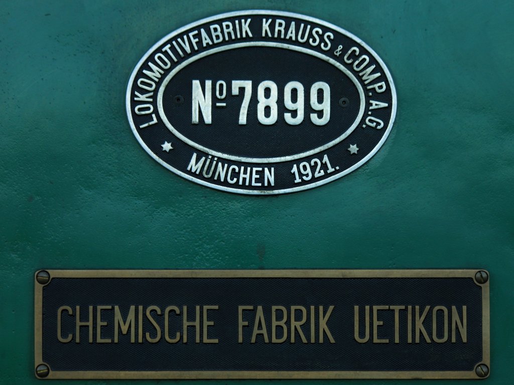 Fabikschild der bei Krauss 1921 in München gebauten Dampflok, die als Rangierlok bei der ältesten Chemischen Fabrik der Schweiz in Uetikon bis 1996 ihren Dienst tat. Heute steht die Lok bei der RWTH Aachen am Institut für Schienenfahrzeuge den Studenten für Studienzwecke zur Verfügung. (11.01.2012)