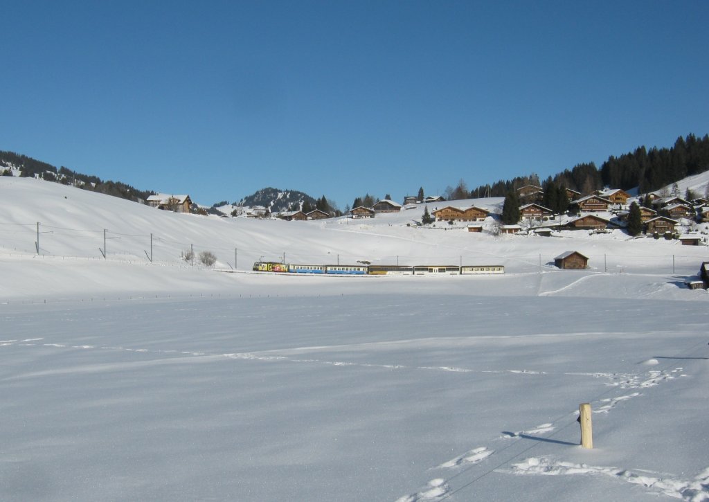 Doppeltraktion 5000er Triebwagen als R 2423 zwischen Schönried und Gstaad, 12.01.2012.