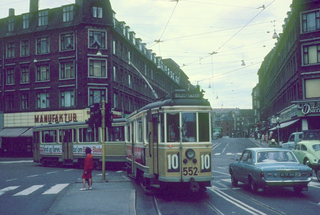 København / Kopenhagen Københavns Sporveje (KS) SL 10 (Tw 552 + Bw 15**) Valby, Toftegårds Allé / Rughavevej im Juni 1968. - Nach der Stillegung der Straßenbahnlinie 9 im Frühling 1966 wurden die Gleise in der Toftegårds Allé von Rughavevej bis Toftegårds Plads nur als Betriebsstrecke für Züge der Linien 10 und 16 verwendet, die vom und zum Betriebsbahnhof Valby fuhren. - Scan eines Diapositivs. Film: AGFA CT 18.