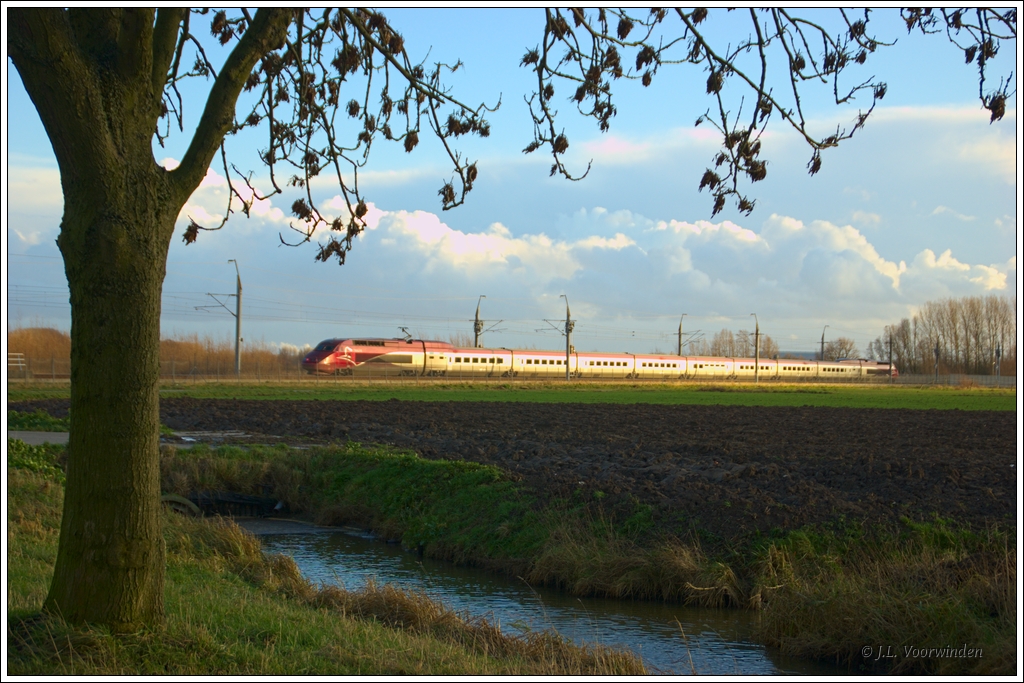 Leider versteckte sich die Sonne hinter einer Wolke wenn dieser Thalys an mir vorbei fuhr. Der Zug fährt auf der Hochgeschwindigkeitsstrecke zwischen Rotterdam und Breda/Antwerpen, hier beim Dorf Heerjansdam. Soeben hat der Zug den Stammstrecke Rotterdam-Dordrecht verlassen, und fährt nun in Richtung Süden; bald wird sich die Geschwindigkeit des Triebzugs erhöhen bis maximal 300 km/h (2. Januar 2012).
