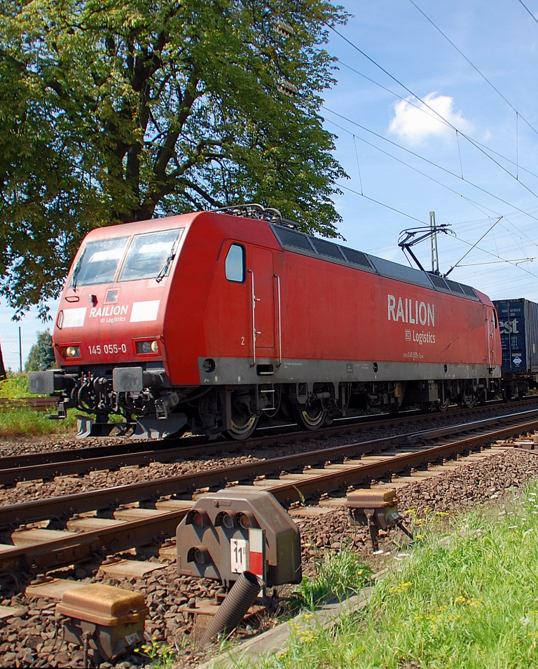 Mit einem Containerzug kommt die 145 055-0 am Rangiersignal im Güterbahnhof Nievenheim vorbei gefahren. Es geht hier in Richtung Köln am 20.8.2011