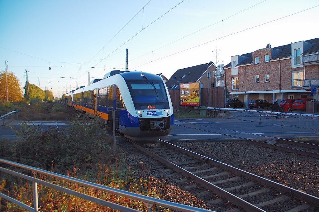 Osterath, Bahnübergang Meerbuscher Straße am 22.10.2011. Gerade kommt ein Doppel 648ziger der NWB als RE 10 nach Kleve in den Bahnhof herein gefahren.