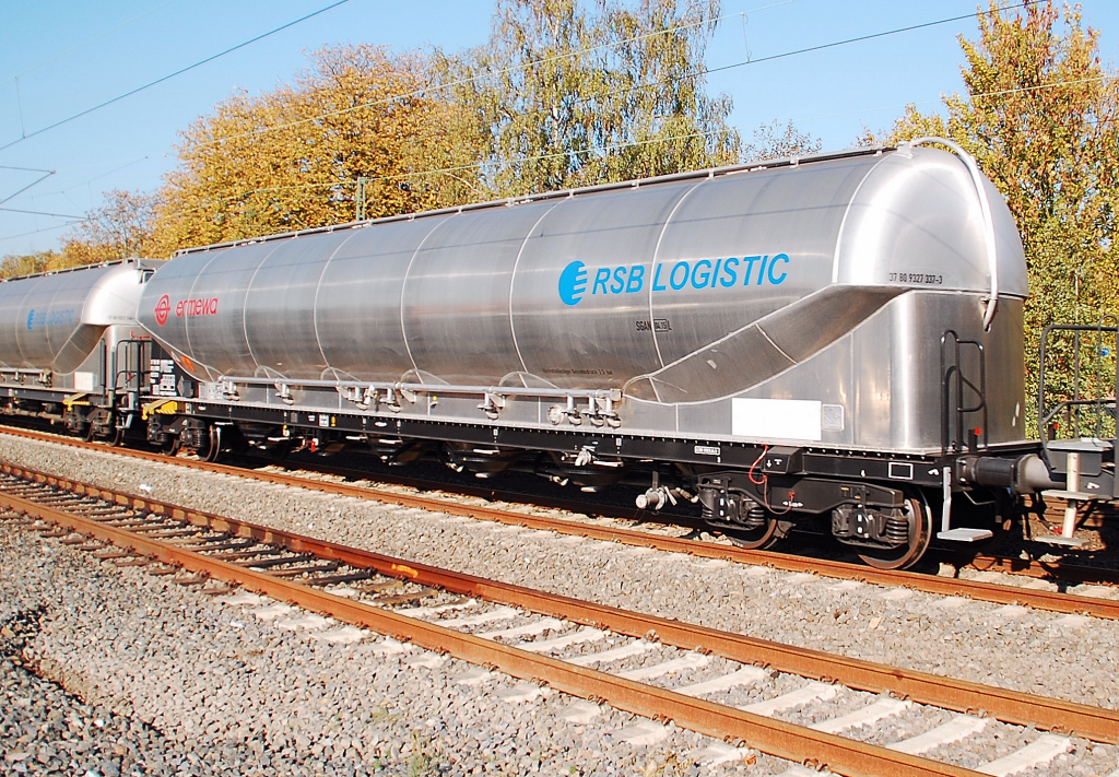 Silowagen der RSB Logistk Nr. 37 80 9217 227-2 in einem Ganzzug gezogen von der Vossloh 275 502-2 in Korschenbroich am 22.10.2011.