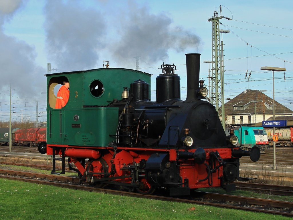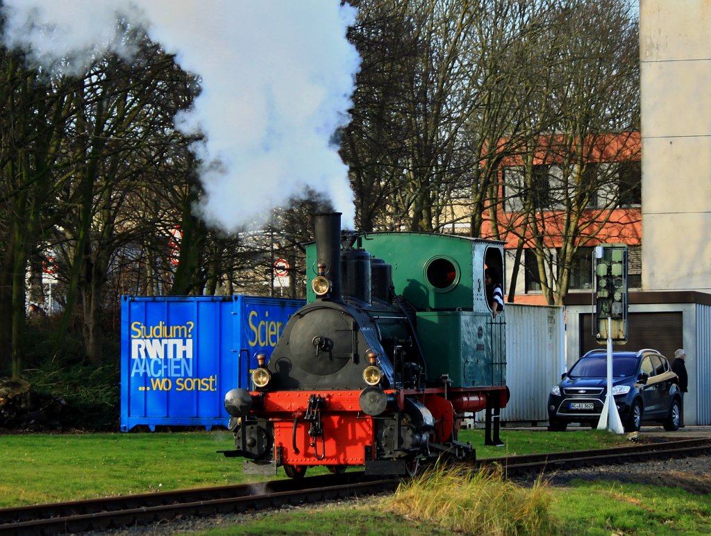 So macht studieren Spaß. Bei der RWTH Aachen am Institut für Schienenfahrzeuge steht den Studenten eine bei Krauss 1921 in München gebaute Dampflok zur Verfügung. Als Rangierlok bei der ältesten Chemischen Fabrik der Schweiz in Uetikon tat sie bis 1996 ihren Dienst. Einmal pro Semester wird die 130 Ps starke Lok angeheizt und die Studenten fahren auf dem kurzen Privatgleis des Instituts und machen dort Laborversuche. Aufnahme vom 11.01.2012 vom Bahnsteig Aachen West.