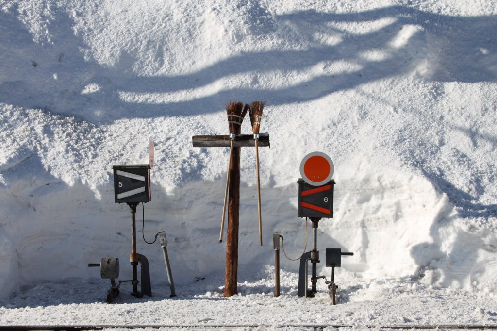 R824 in Oberalppasshöhe-Calmot. Die Feinarbeit bei der Schneeräumung wird zu Fuss erledigt. (10.01.2012)