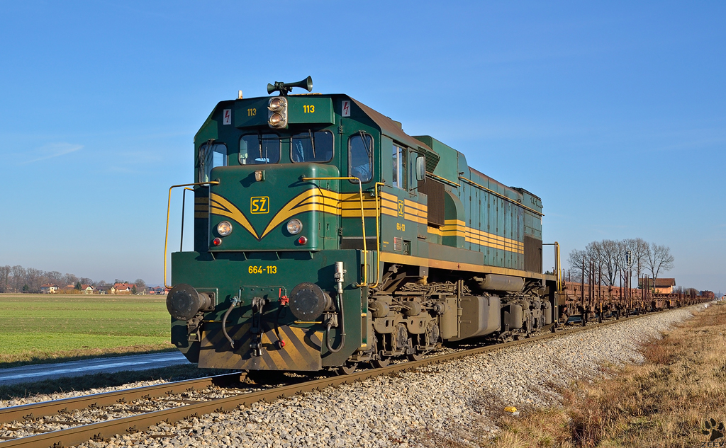 SZ 664-113 mit Güterzug fährt durch Gaj bei Pragersko. / 11.01.2012