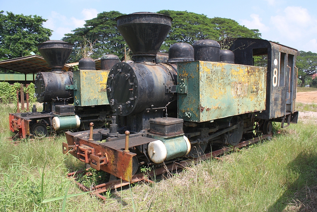 TPI-Ko Kha No.8 (1'B1't-h2, 750mm, Vulcan Iron Works - USA, Bauj. 1947, Fabr.Nr. 4654) am 25.Oktober 2011 in Ko Kha. Vermutlich hatte auch diese Lok einen Zusatztender. Im Hintergrund erkennt man die TPI-Ko Kha No.6.
