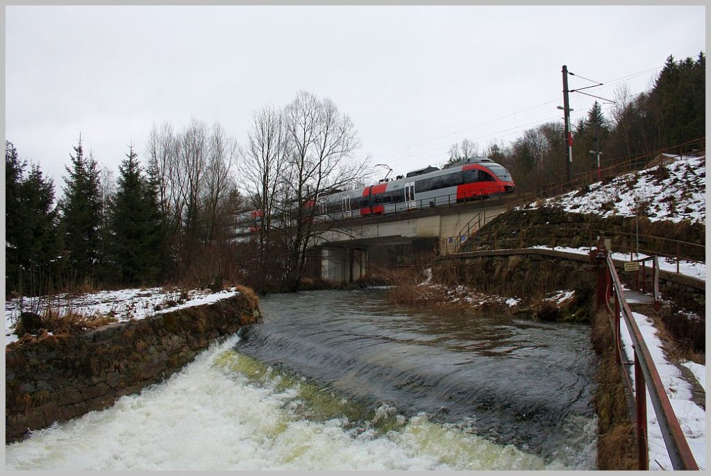 Über die reißende Fischach fährt ein Talent als S2 Richtung Salzburg Hbf. Eugendorf, 7.1.2012
