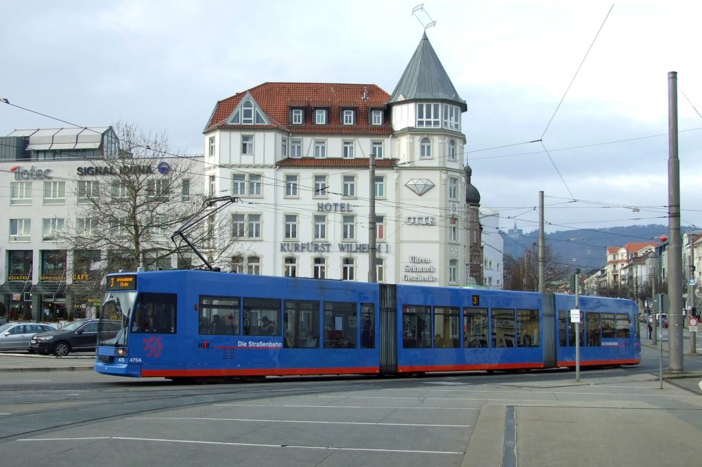 Wagen 475A der HLB am Bahnhof Kassel-Wilhelmshöhe, man erkennt rechts im Bild den Herkules (11.01.2012).