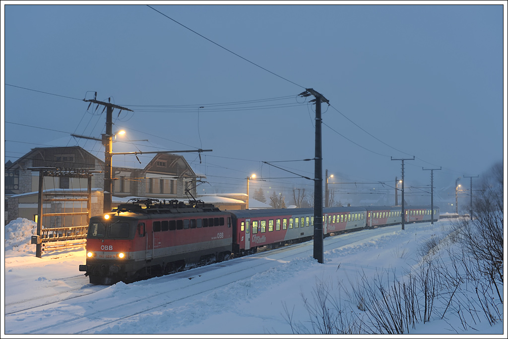 Winter am Pyhrn. 1142 589 als R 3972 von Spital am Pyhrn nach Linz/Donau Hbf am 6.1.2012 beim Halt in Windischgarsten. Leider ist die Lok rund einen Meter zu weit vor gefahren, daher war genau im linken Puffer ein Schild, das ich entfernt habe.