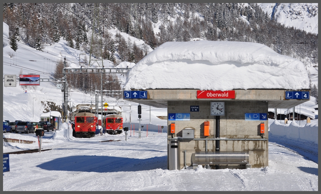 Glacier Express 910 mit einer HGe 4/4 II fährt in Oberwald ein. Es ist schwierig das Zwischenperron auszumachen, auf dem ich stehe, denn nach der Schneeräumung ist alles plattgewalzt. (10.01.2012)