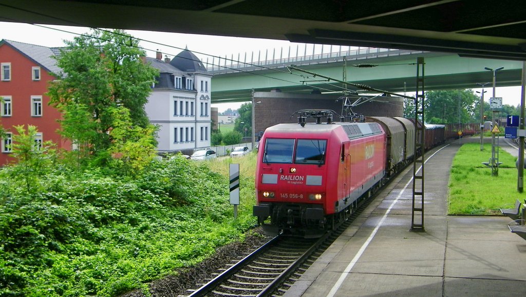 145 056-8 mit einem gemischten Gz bei der Durchfahrt des Haltepunktes Dresden-Kemnitz in Richtung Cossebaude, 30.6.12