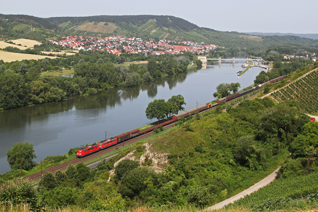 151 140 + 151 146 mit einem gemischten Güterzug am 30.06.2012 im Maintal bei Veitshöchheim.