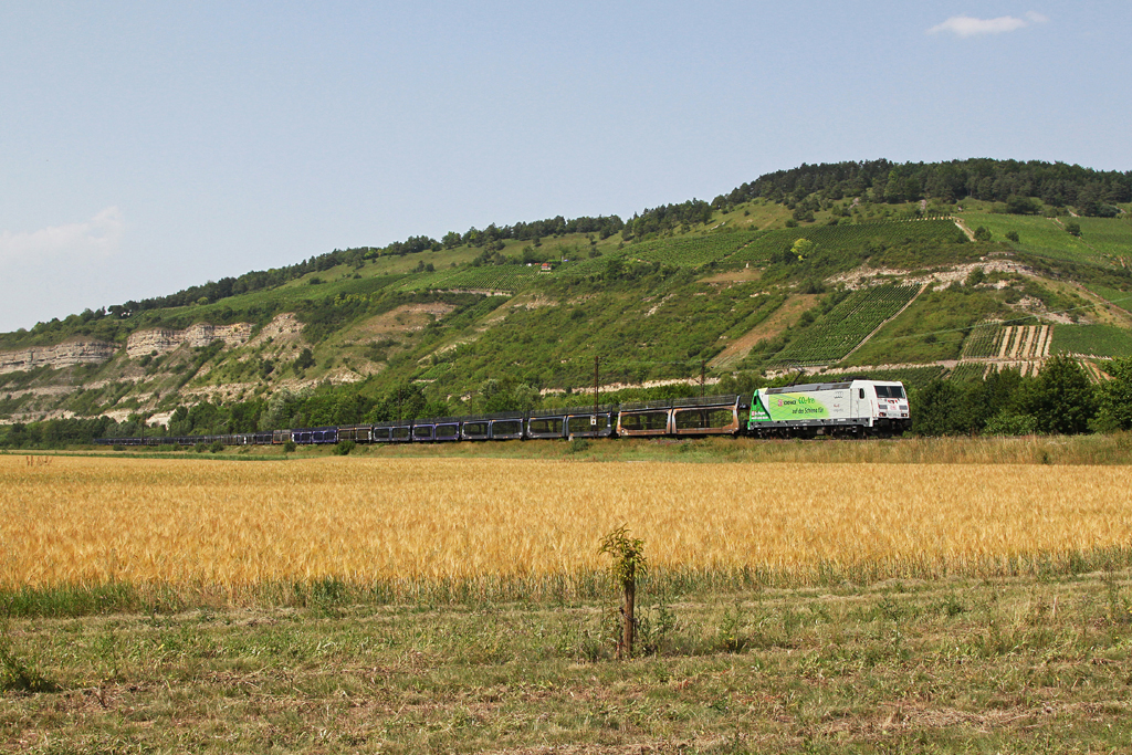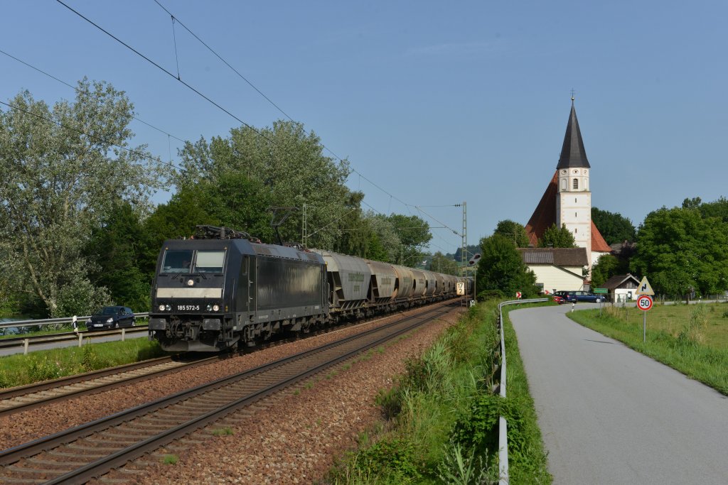 185 572 mit einem Getreidezug am 28.06.2012 unterwegs bei Hausbach.