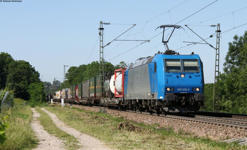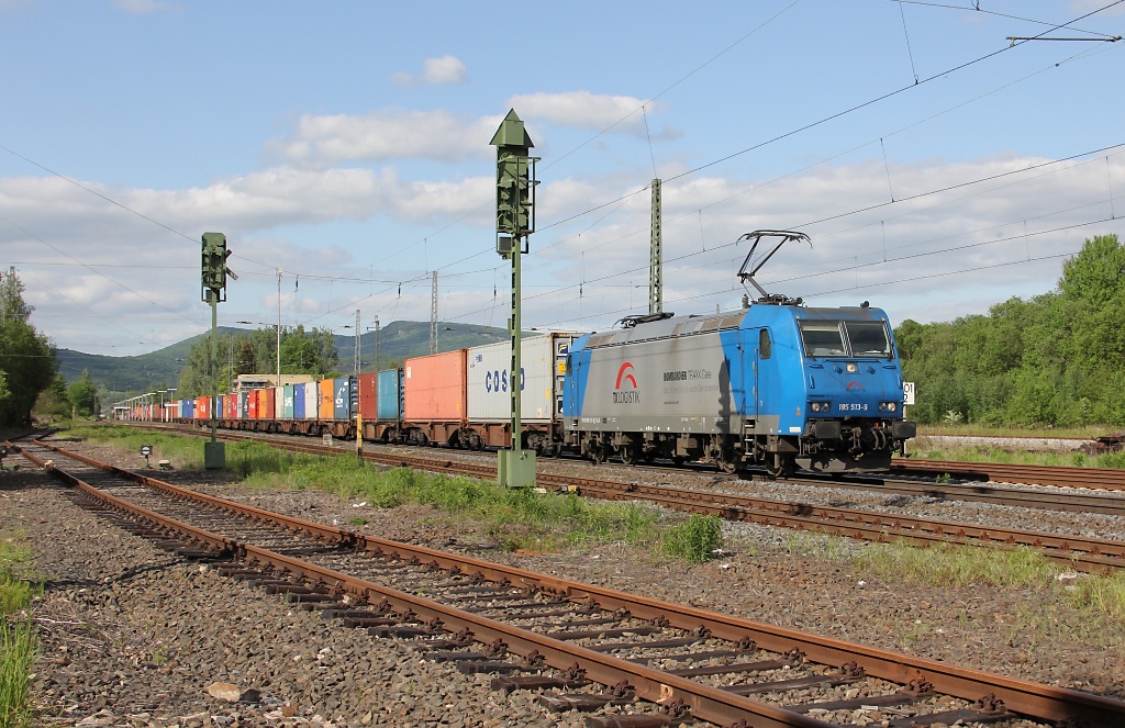 185 513-9 mit Containerzug in Fahrtrichtung Süden. Aufgenommen am 13.05.2012 in Eschwege West.