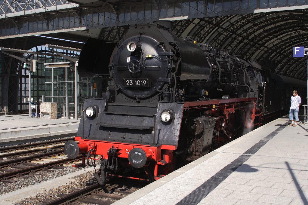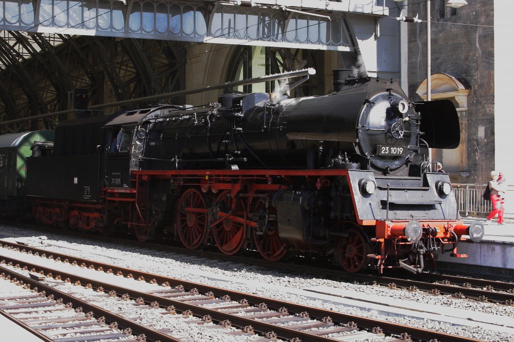 23 1019 mit einem Sonderzug des Lausitzer Dampflokclubs mit Fahrziel Bad Schandau am 23.06.2012 auf Gleis 3 in Dresden Hbf.