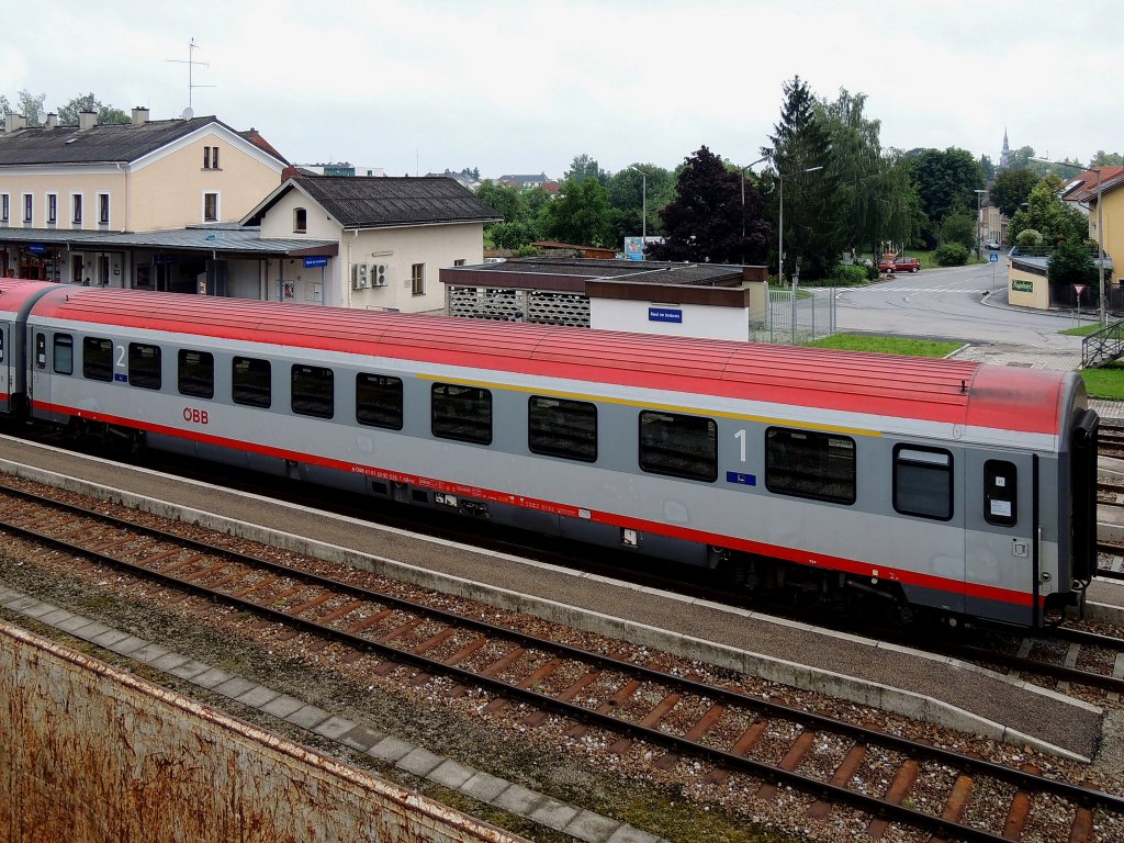 ABmz 61813090036-7 bildete bei D968 den Zugschluß, und wird aufgrund der Streckensperre zwischen Braunau u. Ried nach Lokstürzen mit Zugleistung REX 5967 wieder die Reise Richtung Linz antreten; 120623