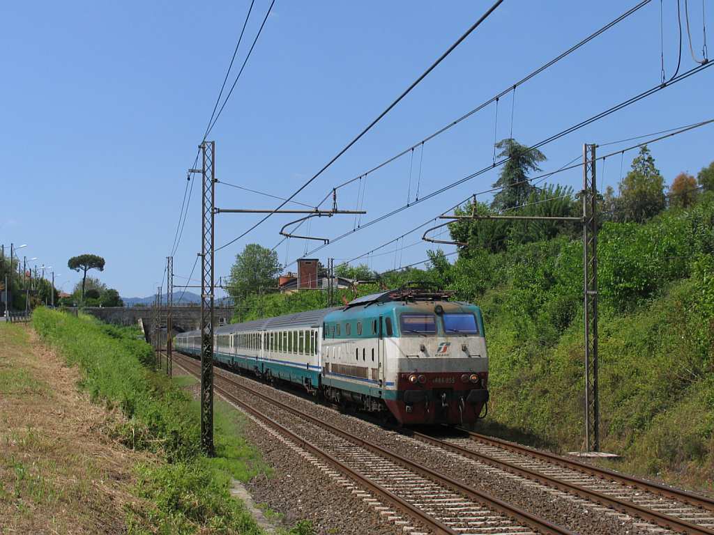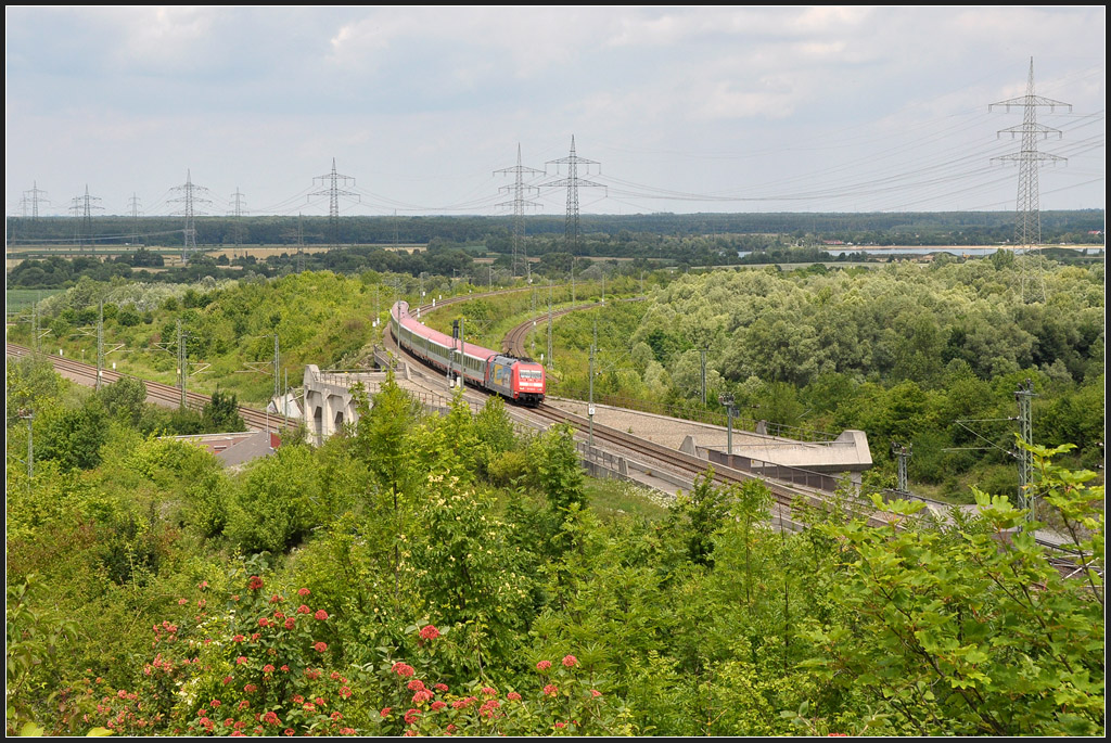 Der IC 119 nach Innsbruck erreicht das Kreuzungsbauwerk und wird gleich in die Hochgeschwindigkeitstrecke Mannheim - Stuttgart einschwenken.