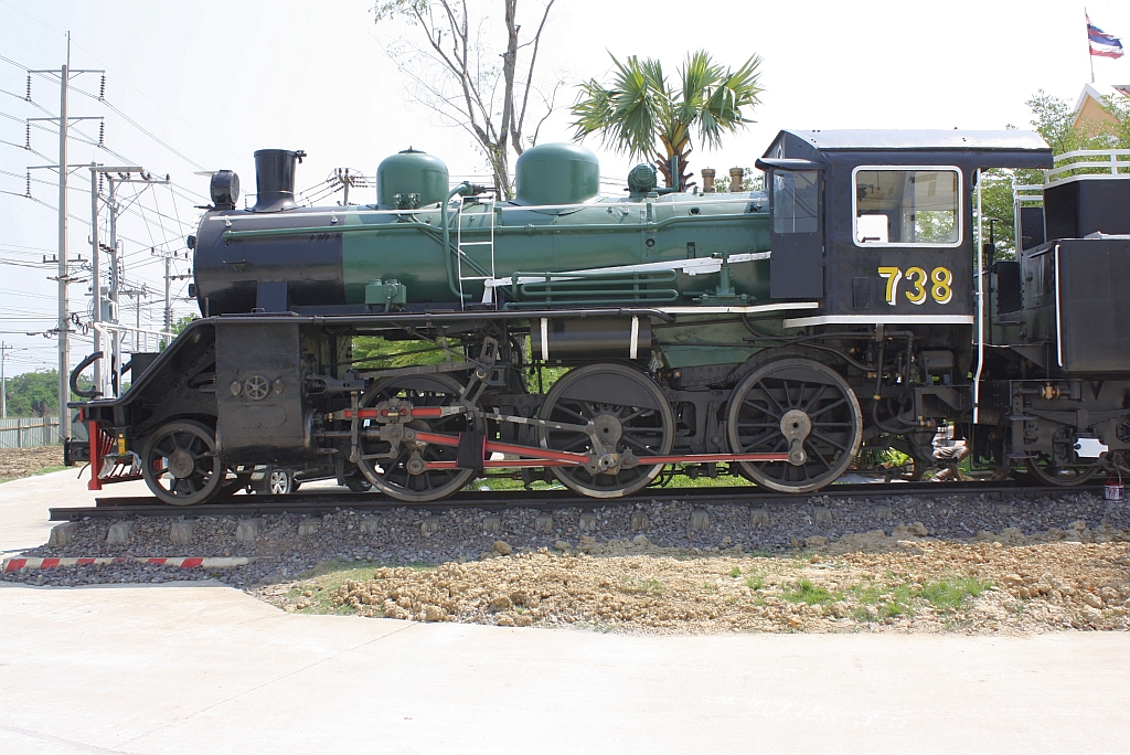 Angeschrieben als 738 / JNR C56.47 steht, in bestem Erhaltungszustand, die SRT 733 (ex JNR C56.41, 1'C-h2, Mitsubishi, Bauj. 1936, Fab.Nr. 176) bei Eingang des FAPO Film Museums in Salaya. Bild vom 17.März 2012.