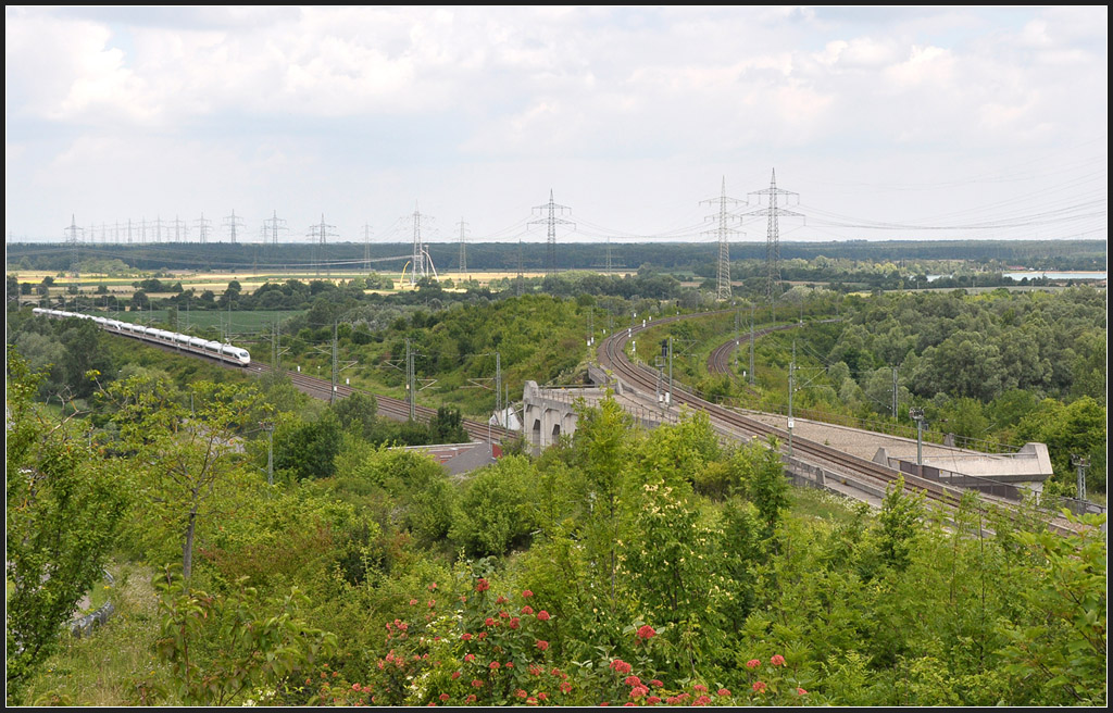 Ein ICE 3 hat den Forster Tunnel verlassen und fährt und wird mit sanftem Anstieg gleich den Rollenbergtunnel erreichen. Vorher unterquert der Zug noch das Verzweigungsbauwerk, mit dem die Bahnstrecke Heidelberg - Karlsruhe in zwei Richtungen an die Hochgeschwindigkeitstrecke angebunden ist.
