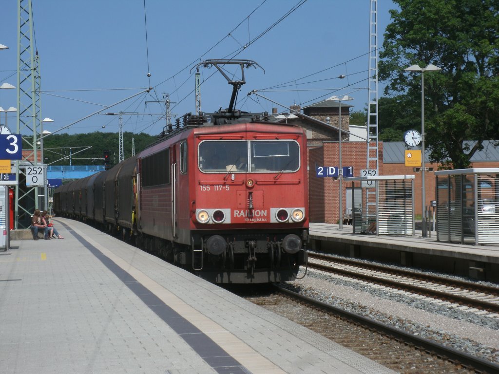 Bevor E18 047 mit ihren Sonderzug das Hauptgleis für einige Minuten besetzte,fuhr 155 117 mit ihrem Güterzug am 30.Juni 2012 durch Bergen/Rügen.