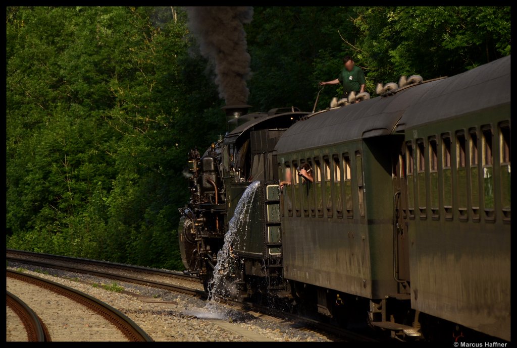 Dampf wird gekocht und der Wasservorrat ist aufgefüllt. Danach geht es mit der S 3/6 3673 (18 478) und mit ihren über 700 Tonnen schweren Sonderzug zurück nach Franken. In Donauwörth übernahm dann wieder die 52 8195-1 ihren Zugteil nach Führt. Bild vom 30. Juni 2012