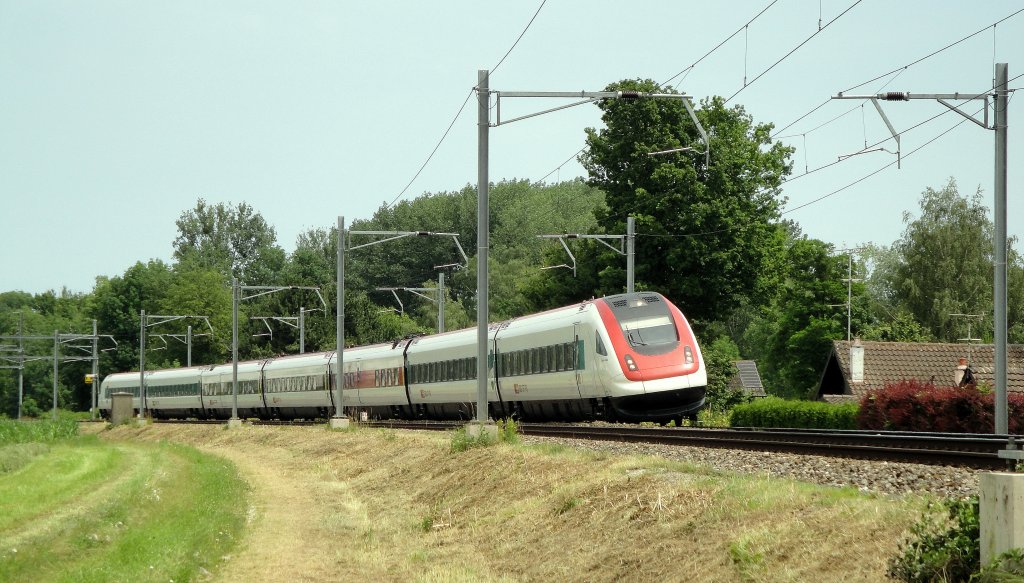 Der ICN RABDe 500 003-9 "Germaine de Staël" legt sich am 28.06.12 bei Onnens in die Kurve.