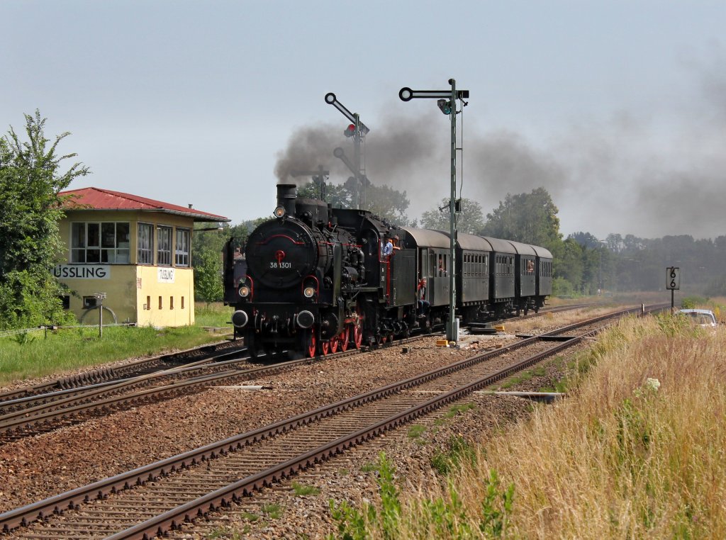 Die 38 1301 mit einem Sonderzug nach Mühldorf am 30.06.2012 bei der Durchfahrt in Tüßling.