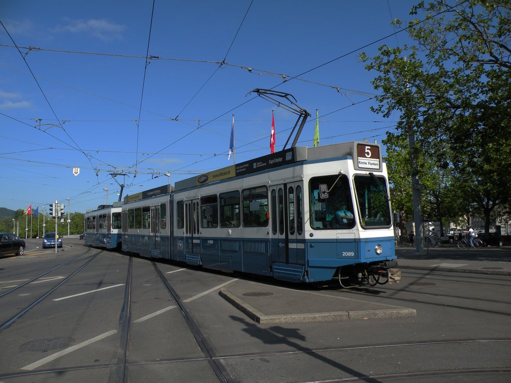 Doppeltraktion mit dem Be 4/6 2089 an der Spitze auf der Linie 5 am Bellevue. Die Aufnahme stammt vom 23.06.2012.