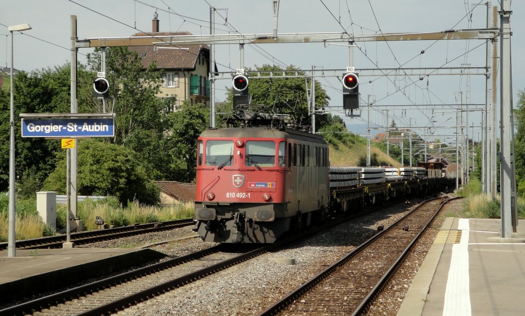 Die SBB Diagnose war am 28.06.12 in Form des XTmass 99 85 9160 001-5 am Westufer des Lac de Neuchâtel unterwegs und verlässt soeben den Bahnhof Onnens-Bonvillars.