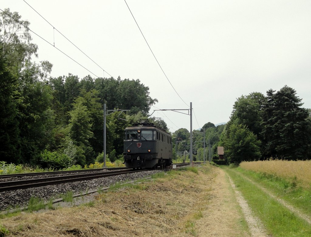 Grün in grün: Am 28.06.12 ist die Ae 6/6 11514 "Weinfelden" alleine auf der Jura-Linie unterwegs, hier bei Onnens.