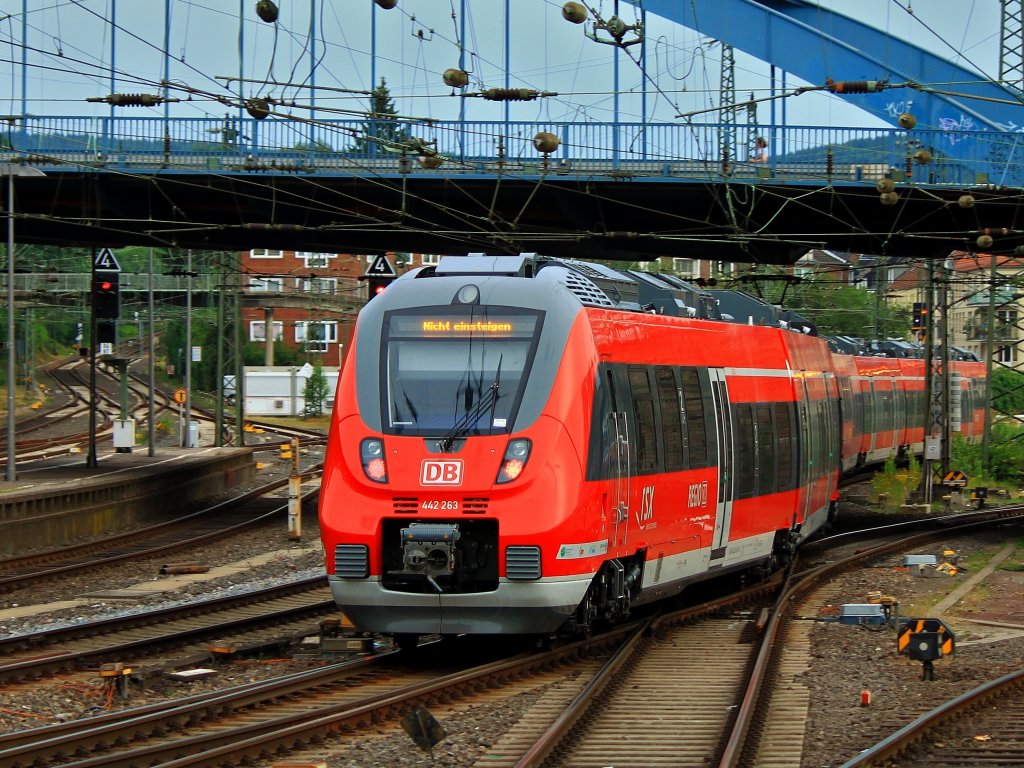 Hamsterbacken-Doppel 442 263 und 442 758 fährt am 28.06.2012 unter der Burtscheider Brücke auf ein Abstellgleis des Bw am Aachener Hbf. Der Zug kam kurz vorher als RE9 von Siegen nach Aachen. Links im Bild ist die Südrampe nach Belgien zu sehen.