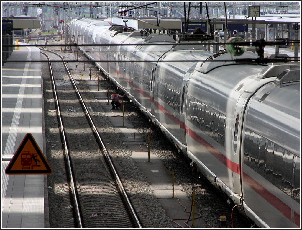 Über die Oberlichtbänder fällt Sonnenlicht streifenförmig in die Halle des Münchener Hauptbahnhof. Der ICE hängt an Schläuchen, vermutlich werden die Wasservorräte aufgefüllt.