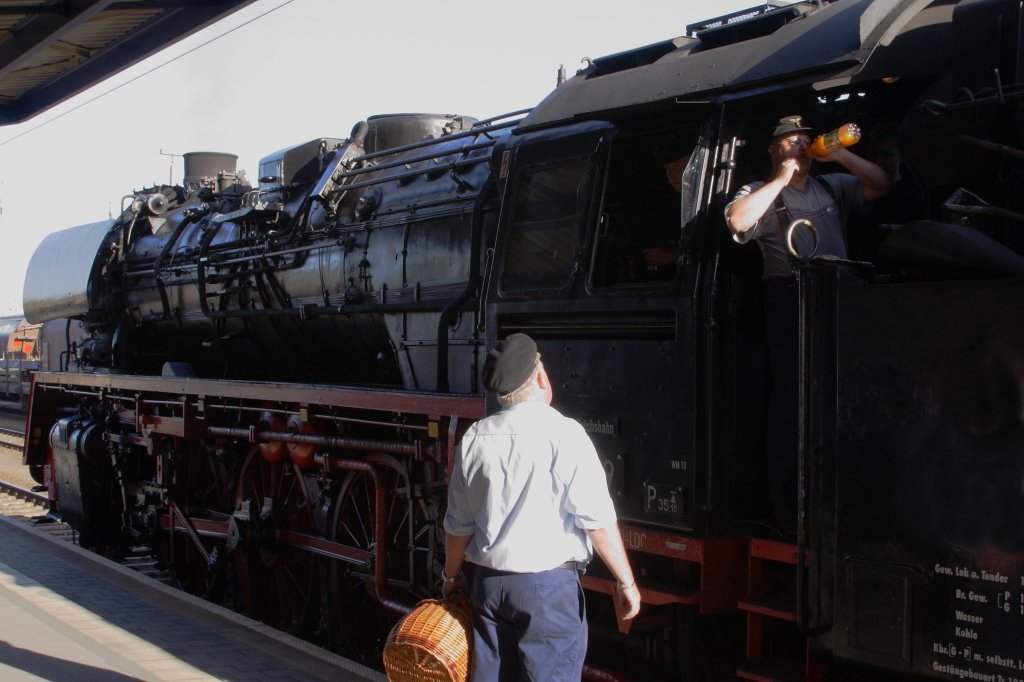 Nicht nur die Dampflok hat Durst und muß verpflegt werden!! Kurz vor Abfahrt des Sonderzuges vom Lausitzer Dampflokclub (LDC) in Richtung Bad Schandau nimmt der Lokführer von 23 1019 noch einen kräftigen Schluck. Die Aufnahme erfolgte am 23.06.2012 am Bahnsteig 1 im Cottbuser Hauptbahnhof.