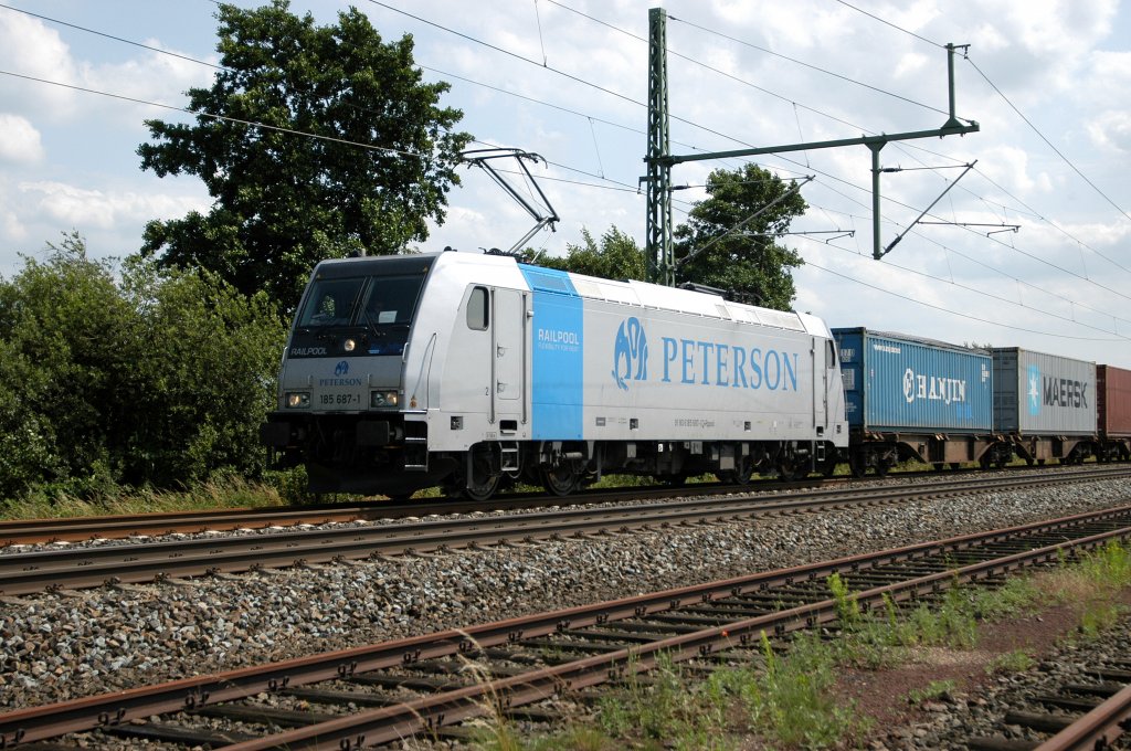 Railpool 185 687, vermietet an Peterson Rail, befindet sich am 30.06.12 südl. von Diepholz mit einem KLV-Zug auf der Fahrt in Richtung Bremen.