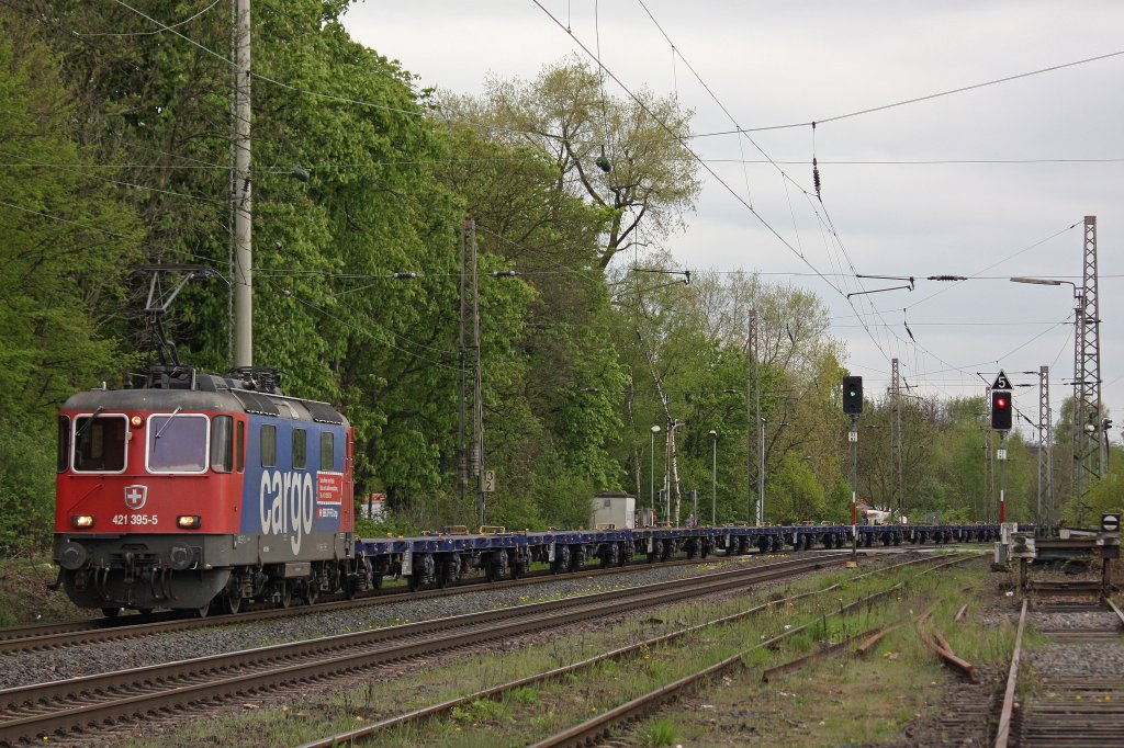 SBB Cargo 421 395 "Suche Mieter oder Käufer" am 27.4.12 mit einem langen Containerwagenzug bei der Durchfahrt durch Ratingen-Lintorf.