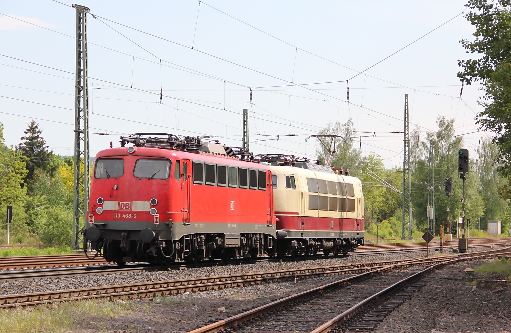 Und noch ein Nachschuss auf die zwei alten Damen! 103 235-8 und 110 468-6 auf ihrem Weg Richtung Süden (FF). Aufgenommen am 15.05.2012 in Eschwege West.